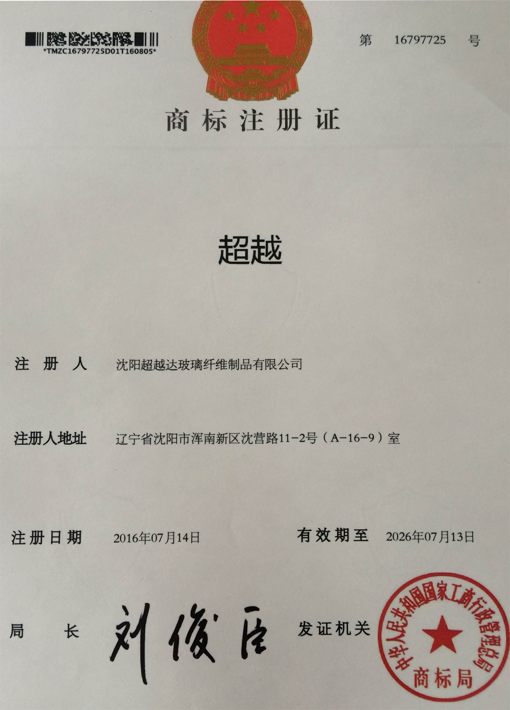 超越商標(biāo)注冊證